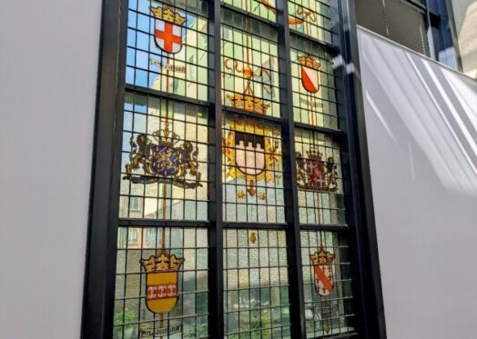 Het wapen van Zeist in het glas-in-loodraam in de publieke hal van het gemeentehuis.